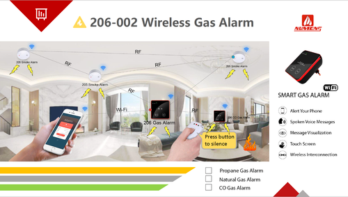 - كاشف تسربات الغاز اللاسلكي هو جهاز يقوم بالكشف عن وجود مختلف من الغازات في منطقة معينة وهو جزء من جهاز الامان في المؤسسات والمنازل. وهو يقوم بالكشف عن تسرب الغاز ومن ثم يتم اصدار صوت انذار للإخلاء من المكان ليقوم المختصين بالتعامل مع المشكلة ويقوم كاشف تسرب غاز بإرسال تنبيه على الجوال من خلال التطبيق.